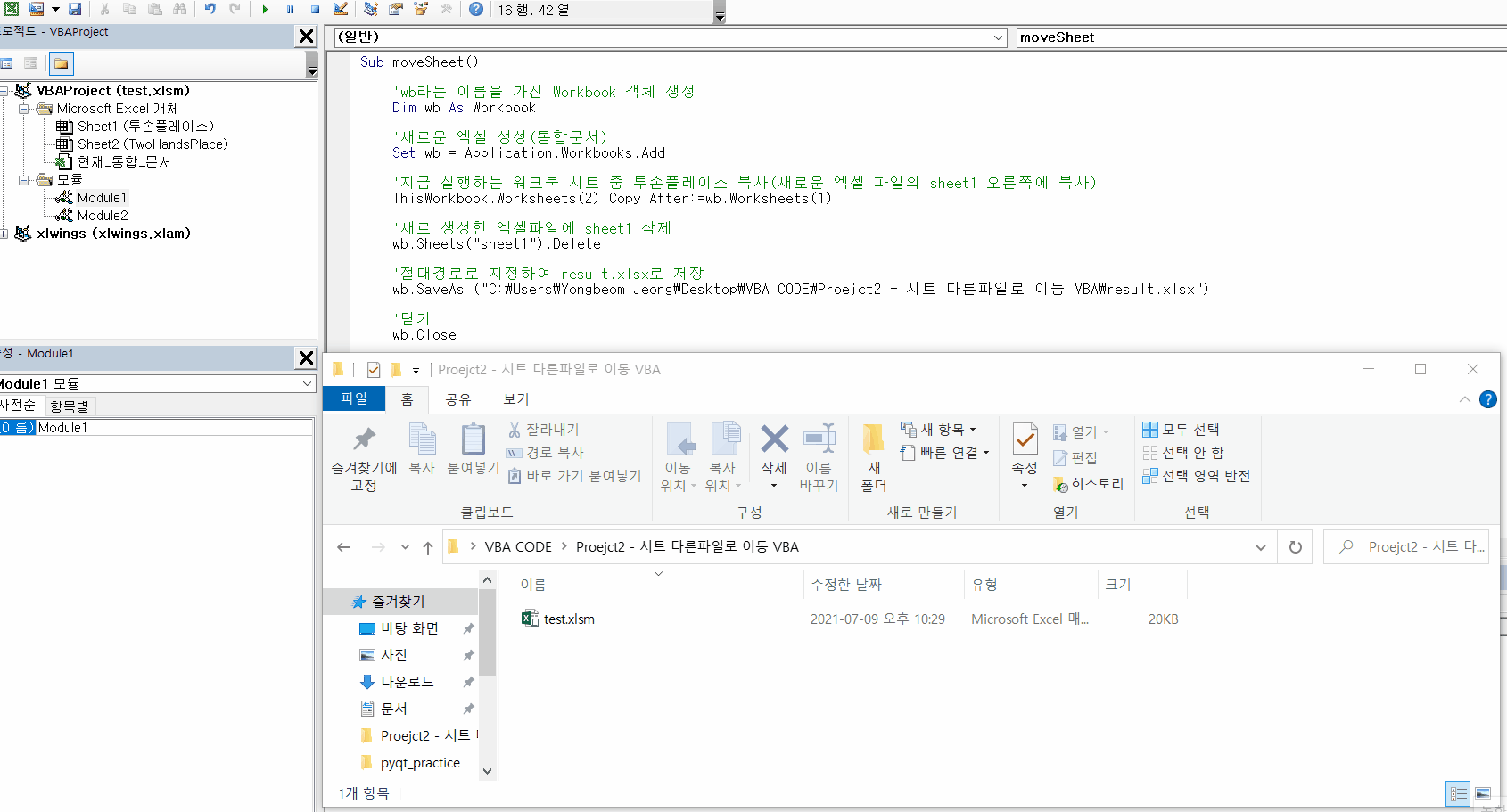 -. 현재 실행중인 파일의 특정 시트를 새로운 엑셀파일로 이동시키기