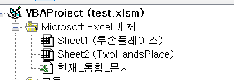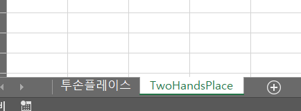 먼저 가상의 매크로 파일을 만들어보자. "test.xlsm"이라는 매크로 파일이며, 해당 파일에는 위 이미지처럼 2개의 시트가 있다. 시트명은 "투손플레이스", "TwoHandasPlace"이다.