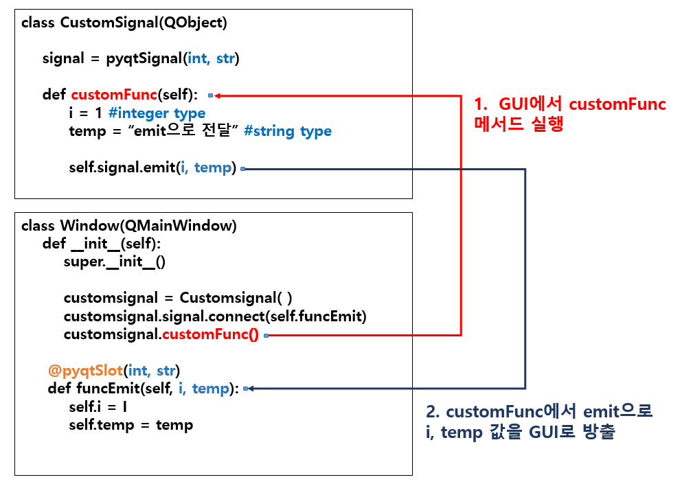 self.signal.emit(i, tempstr) #customFunc 메서드 실행시 signal의 emit 메서드사용