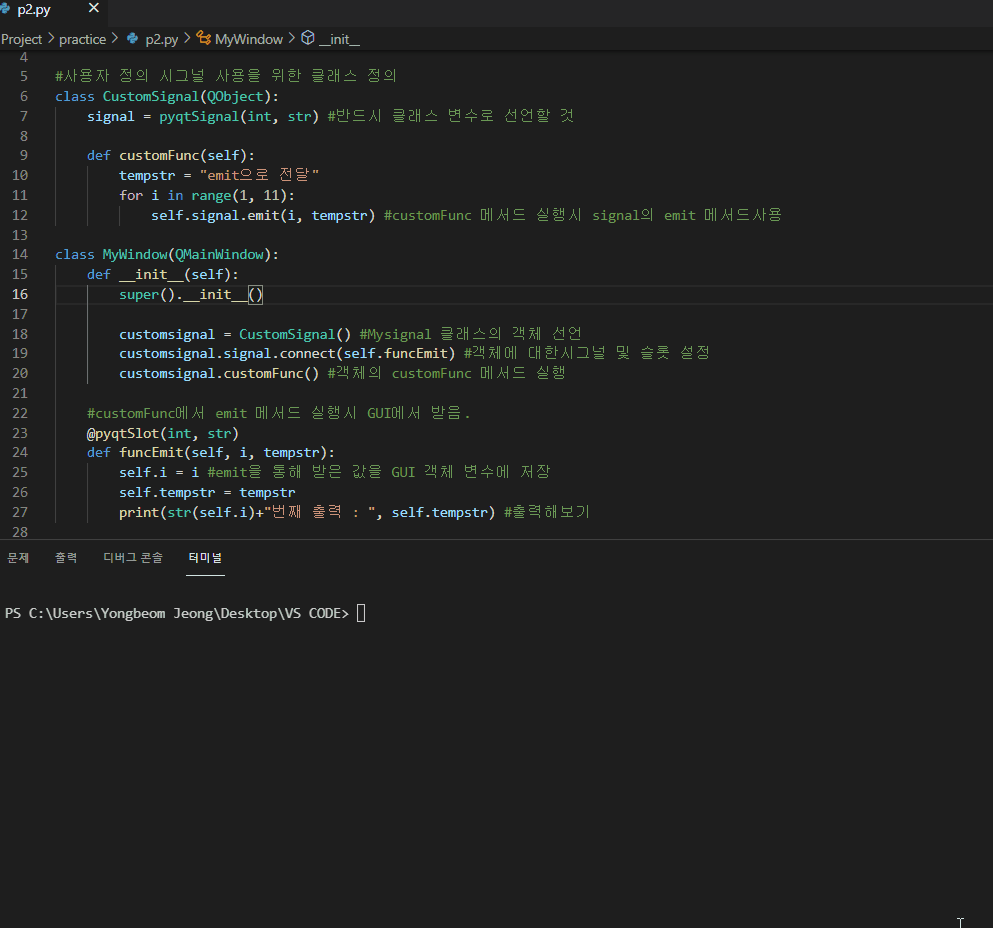 결과 이미지에서 확인해보면 터미널 창에 사용자 정의 signal 클래스에서 GUI에서 읽어와 터미널 창에 출력하는 것을 확인할 수 있다.
