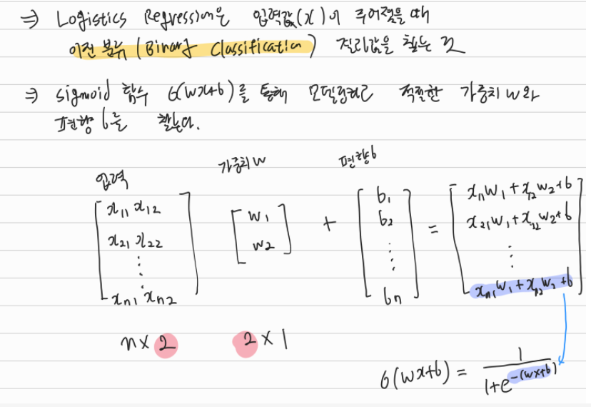 결국, 로지스틱 회귀는 시그모이드 함수를 통해 모델링하고 선형 회귀와 동일하게 시그모이드 함수 수식의 가중치 w와 편향 b를 찾는 것이다. 시그모이드 함수는 가중치 w가 +일수록 경사도가 커지며, 편향 b가 +일수록 왼쪽으로 이동한다. 자세한 내용은 구글링을 하거나 아래 하단의 참고링크를 참고해보면 좋을 것 같다.