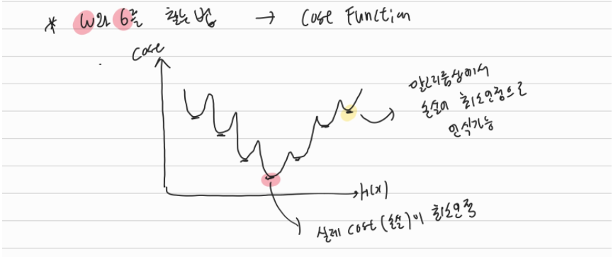 선형 회귀에서는 실제값과 일차방정식(예측값)에 대한 오차를 MSE(평균 제곱 함수)를 통해 Cost Function을 정의한다. 선형 회귀의 Cost Function은 이차 함수이기 때문에 접선의 기울기 = 0인 지점을 찾으면 쉽게 손실 비용이 최소가 되는 w와 b를 구할 수 있었다. 하지만, 로지스틱 회귀에서는 선형 회귀와 같은 방법을 사용할 수 없다. 왜냐하면, 아래의 이미지를 참고해보자.