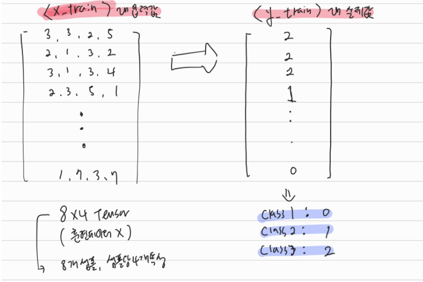 위 훈련 데이터를 도식화하면 아래와 같다. 입력값은 총 8개 샘플이며, 샘플 당 각 4개의 특성을 가지고 있다. 실제값의 Class는 총 3개로 각각 0, 1, 2의 값을 가지고 있다. 실제 소프트맥스 회귀 결과를 확인해보면 레이블이 총 3개인(0,1,2)의 확률값이 각각 표시되는데 Pytorch상에서 레이블 숫자 순서대로 표기해준다.