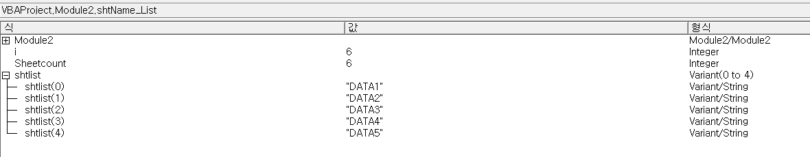 결과 이미지를 보면 알겠지만 시트수에 따라 동적 배열이 Redim 코드를 통해 정의한다. 그리고 각 시트명을 배열에 저장했다.