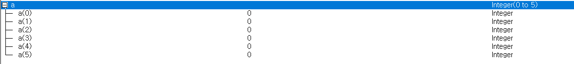 a(0 To 10)의 의미는 배열 a의 index가 10까지라는 의미이다. 혼동할 수 있는데 10이라는 의미는 배열의 크기가 10칸이라는 말이 아니다. 0부터 index가 시작하므로 0~11 총 11개의 data를 담을 수 있는 1차원 배열인 것이다.