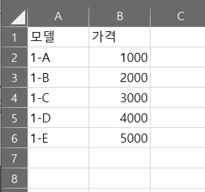 Concept 2. 시트별로 임의로 작성한 모델 및 가격 데이터가 있다. 시트명이 'DATA1'이라면 모델명은 1-알파벳으로 되어있다. 만약 시트명이 'DATA2'라면 2-알파벳인 데이터가 있다.
