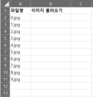 응용 부분에서는 아래와 같이 엑셀에 파일명이 입력되어있을 때, 오른쪽 'B'열에 이미지를 모두 불러오는 코드를 작성해보는 것이다. 당연히 셀 크기도 이미지에 맞게 조정되어야 한다.