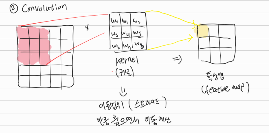 컨볼루션은 연산 과정은 커널이라는 행렬을 입력과 겹쳐지면서 이루어진다. 컨볼루션 연산을 통해 이미지의 특징을 추출하는 역할을 할 수 있다. 실제 구글링이나 아래 하단의 참고링크를 보면 계산과정을 쉽게 찾아볼 수 있으니 연산 과정은 생략한다.
