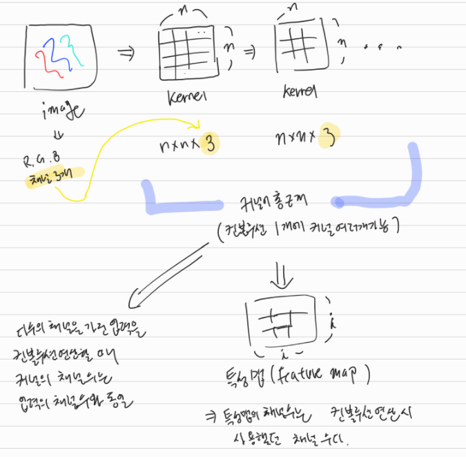 -. 각 커널의 채널수는 입력의 채널수와 동일해야 한다.