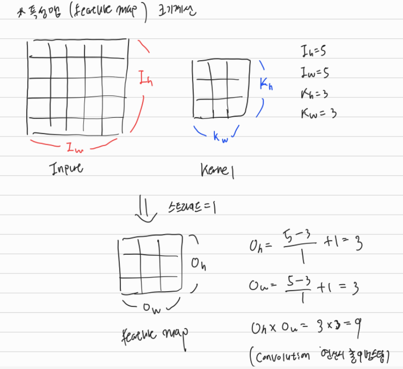 이 그림이 중요한 이유는 실제 CNN 딥러닝 모델에서는 컨볼루션 계산을 여러번 하기 때문에 특성맵의 크기를 정확히 알아야 다음 컨볼루션 층을 구성할 수 있다. 특성맵의 크기를 계산하는 방법은 아래 이미지를 참고해보자.