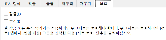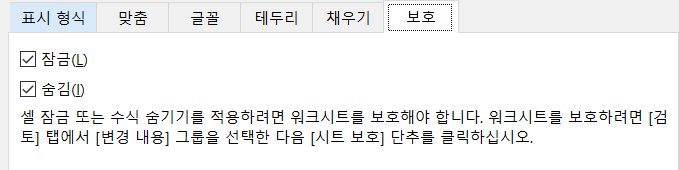 -. 설명에서도 나와있지만 셀 잠금/수식 숨기기를 적용하려면 워크시트를 보호하도록 변경하면 된다.