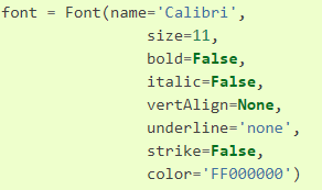 openpyxl 공식 홈페이지에서 제공하는 font 파라미터들. 참고로 strike는 취소선, underline은 밑줄이다.