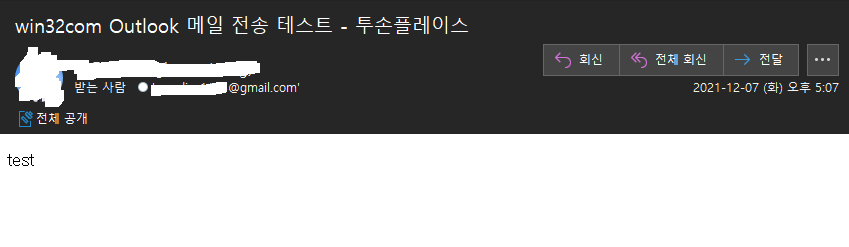 위에서 내가 지정한 메일주소를 통해 메일을 보내면 Outlook - "보낸 편지함"에서는 메일이 전송된 것을 확인할 수 있다. 반대로 ~~@gmail.com 의 수신인 주소에서 메일이 수신된 것을 확인할 수 있다.