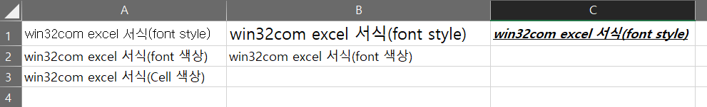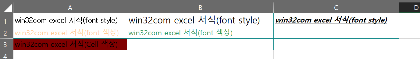 ws.Range("A1:A3").value = "win32com excel 서식(font style)"