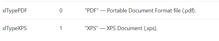 1~2번까지 공부했던 Save, SaveAs 함수의 경우 대상이 되는 객체가 Workbook이지만 ExportAsFixedFormat은 대상이 되는 객체가 Worksheet이다. 이 함수 또한 옵션값이 매우 많으나 아래 4개 옵션만 알아도 사용상 문제는 없을 것 같다.