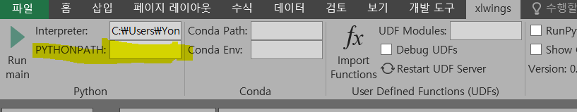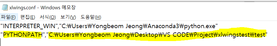 엑셀 xlwings - PYTHONPATH부분에 파이썬 있는 파일 경로를 추가하면 된다. 실제 py1.py 파일이 있는 test폴더로 경로를 수정하고 실행해보자.