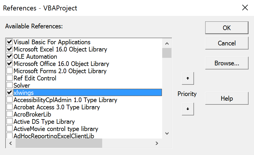 ※ 주의 : 엑셀 파일(py1.xlsm)에서 xlwings를 참조해야 정상적으로 실행 됨(아래 이미지 참고)