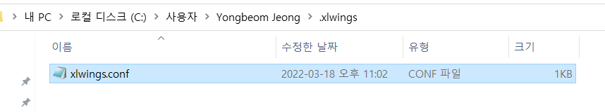 xlwings 라이브러리를 설치했다면 위 사용자 폴더에 xlwings.conf 파일이 생성된다. 이 파일을 실행해보자.