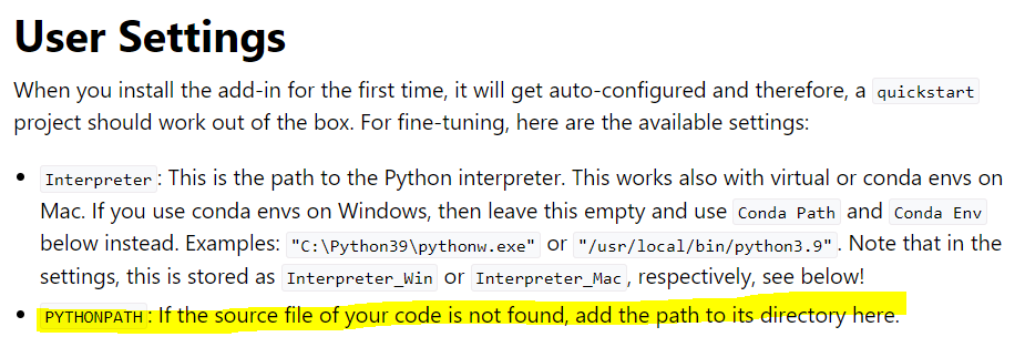 에러 메시지를 요약하자면 py1이라는 파일을 찾을 수 없다는 것이다. 그럼 같은 경로에 있는 파이썬 파일만 불러올 수 있는걸까?? 구글링을 해보니 xlwings 공식홈페이지에서 환경변수들에 대한 정보를 제공하는데 파이썬 파일의 path를 설정할 수 있다.