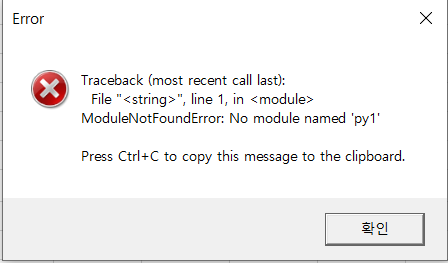 위 이미지의 "py1.py"파일의 경로를 test 라는 폴더를 생성하여 이동시켰다. 실제 업무상에는 공용 서버 위치가 될 수 있다. 즉, 엑셀 매크로 파일인 py1.xlsm과는 다른 경로에 있는 상태이다. 그 상태에서 엑셀 매크로를 실행해보자. 그럼 아래와 같이 에러메시지가 출력된다.