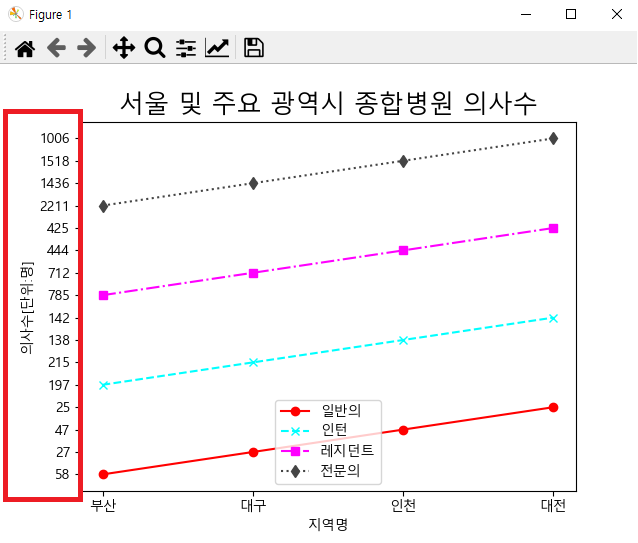 아래 이미지의 csv 파일(doctor_data.csv)에 접근하여 지역별 의사들의 숫자를 꺾은선 그래프로 나타내주는 시각화를 진행해보았다. 다만, 시각화를 할 때 y축 숫자가 뒤죽박죽 섞여서 나오는 문제가 있어 한참을 해멨다. 이번 포스팅에서는 그 과정과 해결방법을 기록한다.