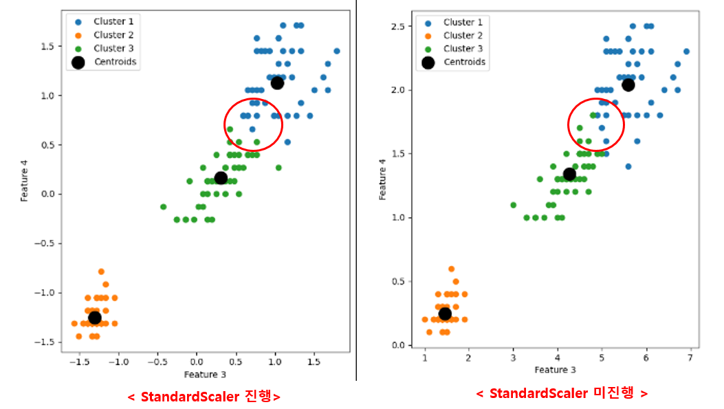 표준화에 따른 차이가 있나 확인해보고 싶어 Feature3(Petal Lenghth), Feature4(Petal Width)의 클러스터링 시각화 자료를 비교해보았다.