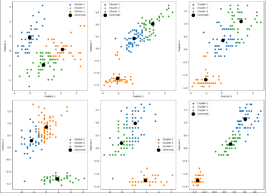Iris dataset은 feature가 4개인 데이터셋이다. 벚꽃의 품종을 구분하는 데이터셋으로 cluster=3이라는 것을 이미 알고 있다. 코드 상에서 cluster=3으로 선정하고 2개의 Feature를 선택하여 모든 경우의 수를 시각화해보았다. 거리 기반 알고리즘이므로 sklearn의 StandardScaler를 통해 표준화를 진행했다. 아래에서 표준화 여부에 따른 클러스터 결과도 살펴볼 것이다.