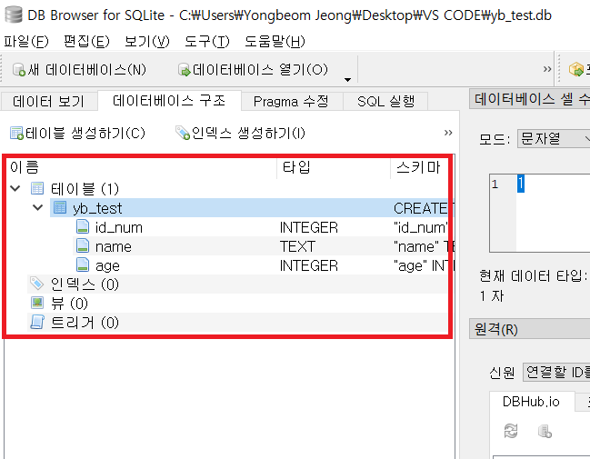 이전 편에서 'yb_test.db'라는 파일을 새로 생성하였다. 이 파일을 열기하여 생성 된 Table을 확인할 수 있다.