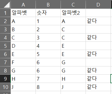 ws['D'+str(row_index)] = "=IF(A"+str(row_index)+"=C"+str(row_index)+',"같다","")'