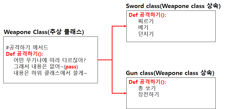 추상 클래스는 클래스 내부의 메서드들이 내용은 빼고 이름만 정의된 클래스라고 한다. 지금까지 예를 들었던 무기 클래스를 예시로 들어보면 무기는 attack()이라는 메서드를 가질 수 있지만, 내부 구현 내용은 총인지 검인지에 따라 내용이 달라질 수 있다는 것이다. 아래 그림과 같이 쉽게 도식화해보았다.