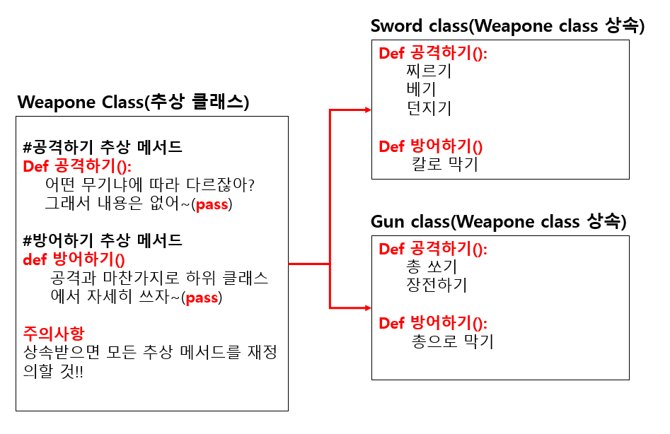 metaclass=ABCMeta를 입력해주면 된다. 추상 메서드를 정의하는 방법은 메서드명 위에 @abstractmethod를 쓰면 된다. 자세한 내용은 아래 코드 참고!!