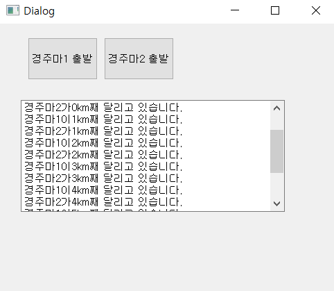 self.parent.textBrowser.append("경주마1이"+str(i)+"km째 달리고 있습니다.")