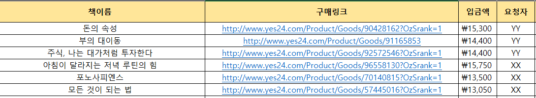 -. 아래와 같은 엑셀 양식에서 필요한 정보 읽어오는 역할(구매링크를 리스트로 받아옴)