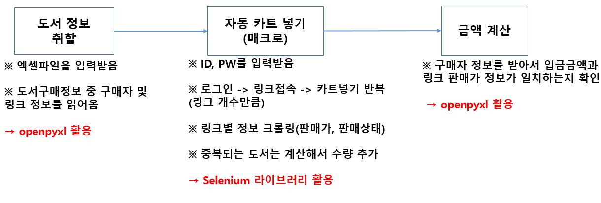 도서 정보를 여러 사람에게 취합해서 자동으로 카트(장바구니)에 넣어주는 자동화 프로그램을 제작하였다. 해당 프로그램은 도서를 여러 사람들에게 취합하여 한번에 구매가 필요한 곳에 유용할 것 같다.(독서모임, 회사 도서 단체 구매 등)