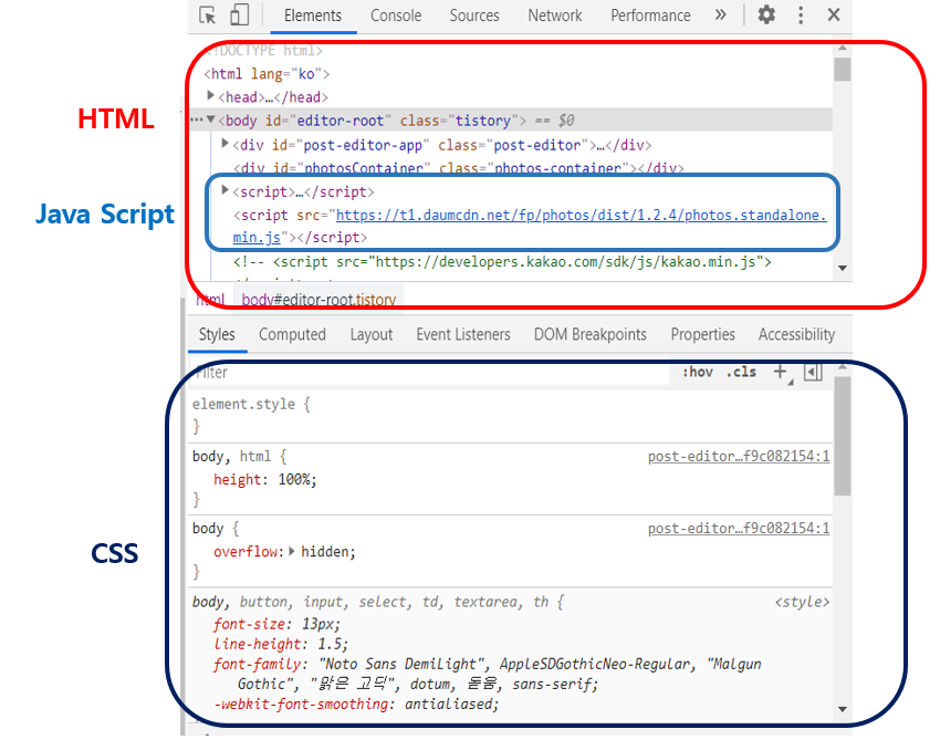 아직 제대로 공부하진 않았지만 직관적으로 어느정도는 구분할 수 있었다. <head></head>, <body></body>와 같은 태그는 웹페이지의 뼈대를 나타내는 HTML이다. HTML 내부에 <script></script>는 웹의 동작을 구현하는 Java script 코드라고 한다.(무슨 동작인지는 아직 잘모르겠다.) 밑에 칸으로 구분되어 뭔가 style, font-size, 글씨체 같은 내용이 나와있는 것은 CSS라는 것을 알 수 있었다.