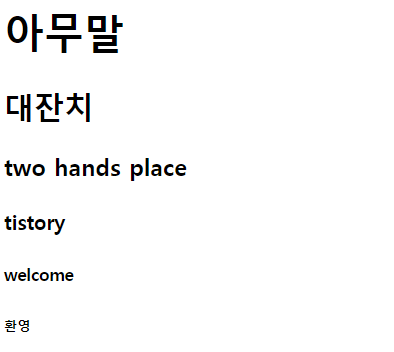HTML에서 제목을 나타내는 요소는 위 태그를 사용한다. 아래 코드와 같이 1~6을 사용할 수 있으며 숫자가 클수록 크기가