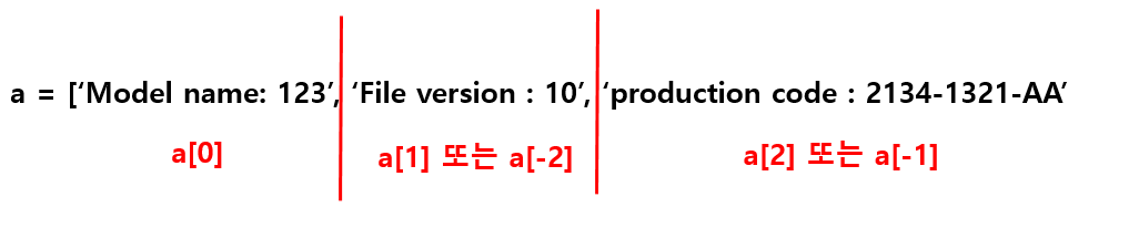 -. 함수 첫줄의 split 함수는 문자열을 특정 문자 기준으로 분리하여 리스트로 변경할 수 있다. 위 엑셀파일 기준으로 a는 아래 3개 문자열 요소를 가진 리스트이다.