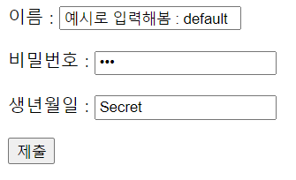 <p>비밀번호 : <input type="password" name="password" value="안보임"></p>