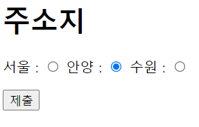안양 : <input type="radio", name="address", value="anyang" checked>