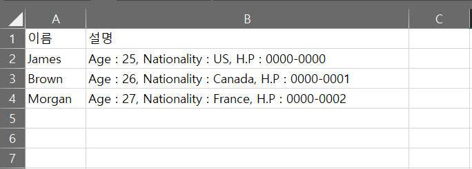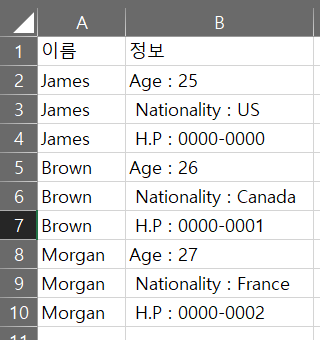 앞서 설명한 예시대로 위 엑셀 양식에서 이름 별로 Age, Nationality, H.P를 분리하여 구분하는 코드를 작성해보았다. 구분자는 ","이다. 위 시트명은 "DB"이고 새로운 구분 데이터를 출력할 곳은 "분류" Sheet이다.