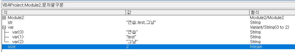 위 1번 예시코드에서 size라는 integer 변수를 선언하고 size = UBound(var)를 넣어보면 배열의 크기인 2를 반환하는 것을 확인할 수 있다.