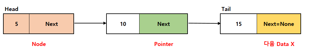 -. Next=None(또는 Null) : 다음 데이터가 없을 경우 포인터의 주소값은 None(또는 Null)이다.