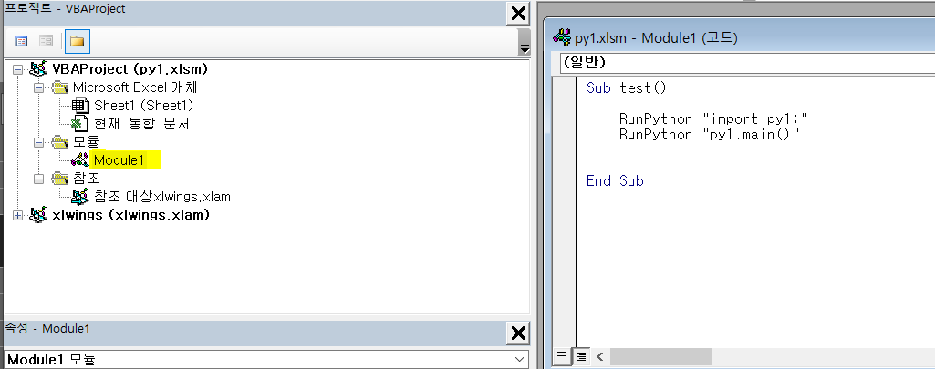 아직 기초만 다뤄서 정확히 모르지만 VBA에서 xlwings 모듈을 통해 파이썬 코드를 호출하려면 RunPython이라는 함수를 사용하면 되는 것 같다. 오른쪽은 string으로 py1.py파일을 import하고 py1의 main함수를 실행시키는 코드이다.