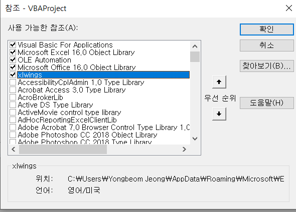 파이썬의 xlwings 모듈을 사용하기 위해선 VBA에서 xlwings 모듈을 참조할 수 있도록 설정해야 한다. 2)의 VBA 개발 창에서 도구-참조 매뉴를 선택하면 아래 창이 나온다. 아래 창에서 xlwings를 체크해준다.