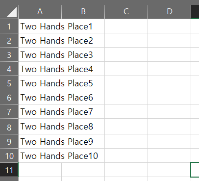 먼저 아래와 같이 임의의 엑셀 VBA 코드를 작성해보았다. sheet1에 A열 1~10행까지 "Two hands Place"를 10번 출력하는 VBA 코드이다. 해당 엑셀파일의 파일명은 'py1.xlsm' 이다. VBA를 실행시켜야 하므로 반드시 확장자는 .xlsm 이어야 한다.