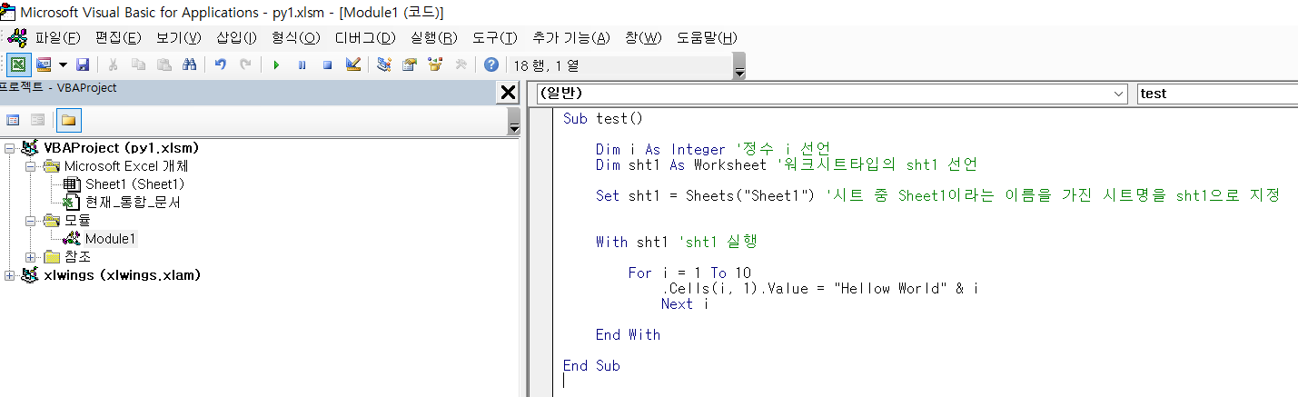 엑셀 VBA에서 특정 모듈을 작성할 때 Sub 모듈명() ~ End Sub로 지정한다. 내가 작성한 코드는 'test'라는 이름을 가지고 있는 모듈이며, 파이썬에서 'test'라는 이름을 가지고 매크로를 불러올 예정이다.