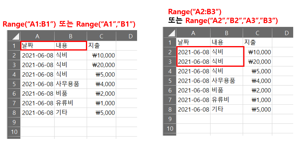 엑셀에서 셀 영역을 가리키는 코드는 Range와 Cells이다. 아래와 같은 예시로 정리해보았다.