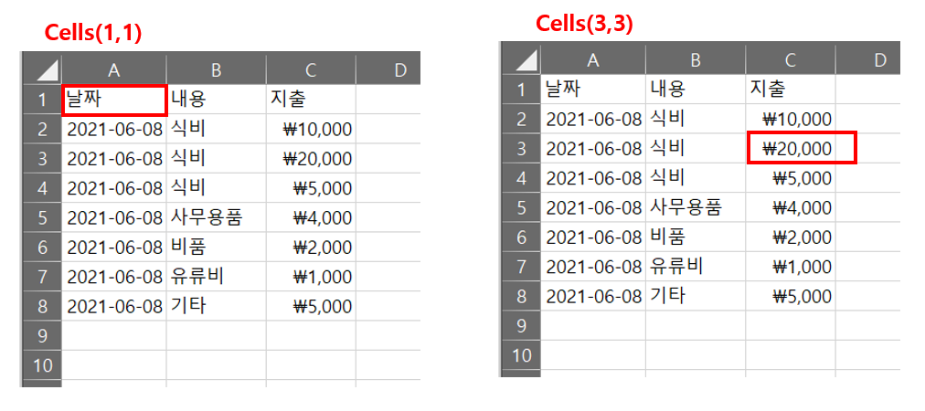 -. Cells은 시트의 각 셀 영역을 숫자로 표현한다. 1행 1열 기준 Cells(1,1)이다.