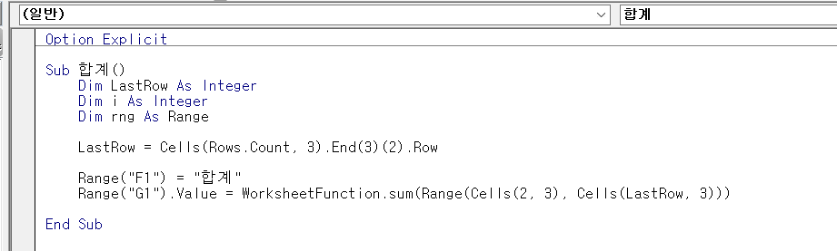 위 기능을 구현하기 위해선 합계를 계산할 영역을 먼저 구해야 한다. 데이터가 추가될 때마다 마지막 행값을 알 수 있는 코드를 작성해주어야 한다. 마지막 행값은 여러가지 표현식으로 구할 수 있다. 대표적인 방법 3가지만 정리해보았다.